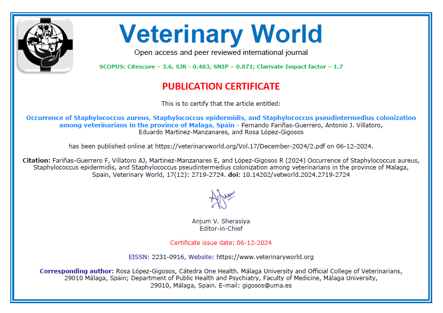 Es un gran placer el poder comunicar que ha sido publicado online, el pasado 6 de diciembre de 2024, el primer estudio que la Cátedra One Health realizó hace casi año y medio, en Veterinary World – Open access and peer reviewed international journal.